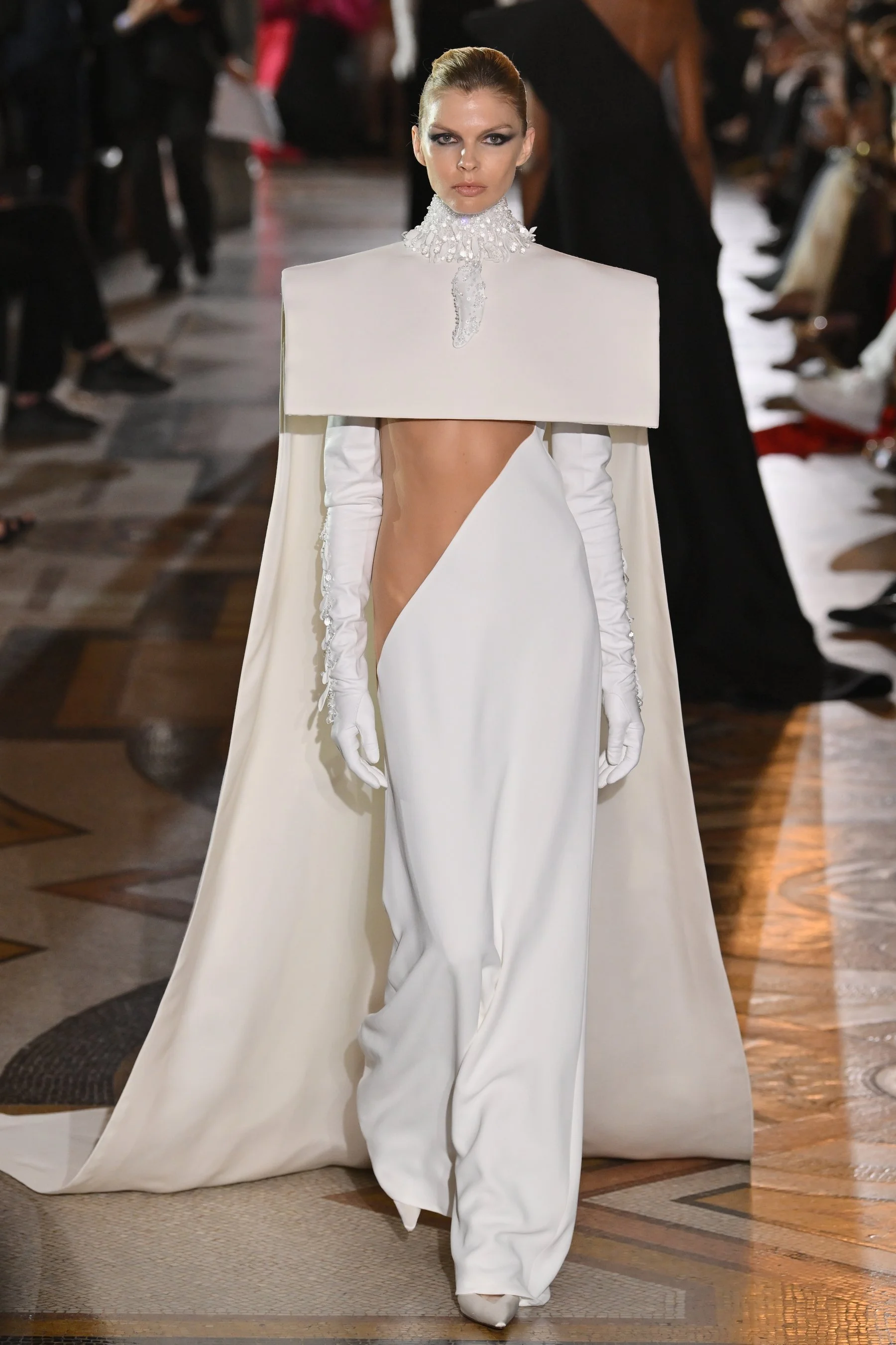 Rolland's collection served as a captivating visual narrative, reflecting the palette of emotions that mirrored Callas's personal journey and offering spectators a glimpse into the depths of her inner world. The show commenced with a show-stopping ensemble—a breathtaking long "Callas" wool gazar dress in black, embellished with white leather glove-sleeves. This opening look set the stage for an unforgettable voyage through the ethereal realm of haute couture, as Rolland's visionary artistry unfolded, revealing an ensemble of masterpieces that effortlessly embodied the spirit of Maria Callas.